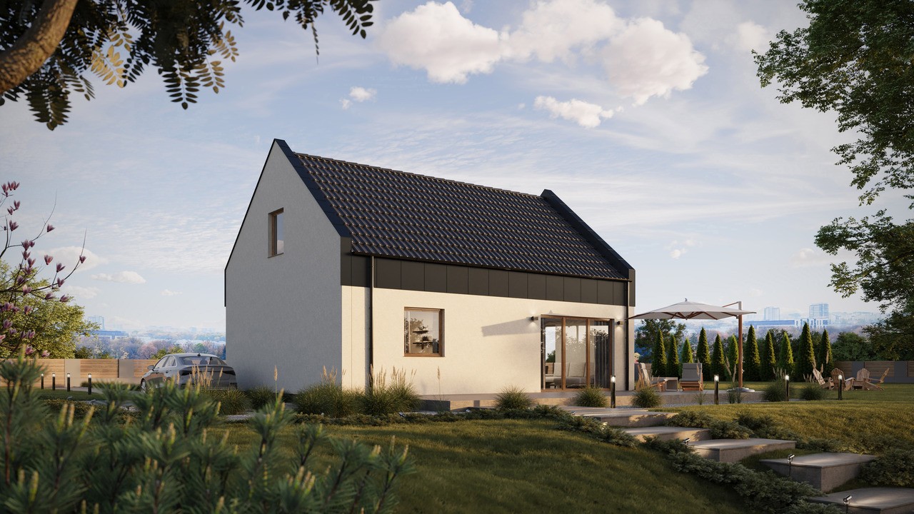 Projekt ERDOL 1 XL PLUS posiada nowoczesny, dwuspadowy dach z poddaszem użytkowym o kącie nachylenia 40 stopni oraz wyposażony jest w stolarkę okienną PVC firmy EUROCOLOR SYNEGO na profilu marki REHAU o szerokości 80mm. Montowane drzwi zewnętrzne to drzwi firmy WIKĘD model 26h, ościeżnica Optimum Termo z szybą reflex.