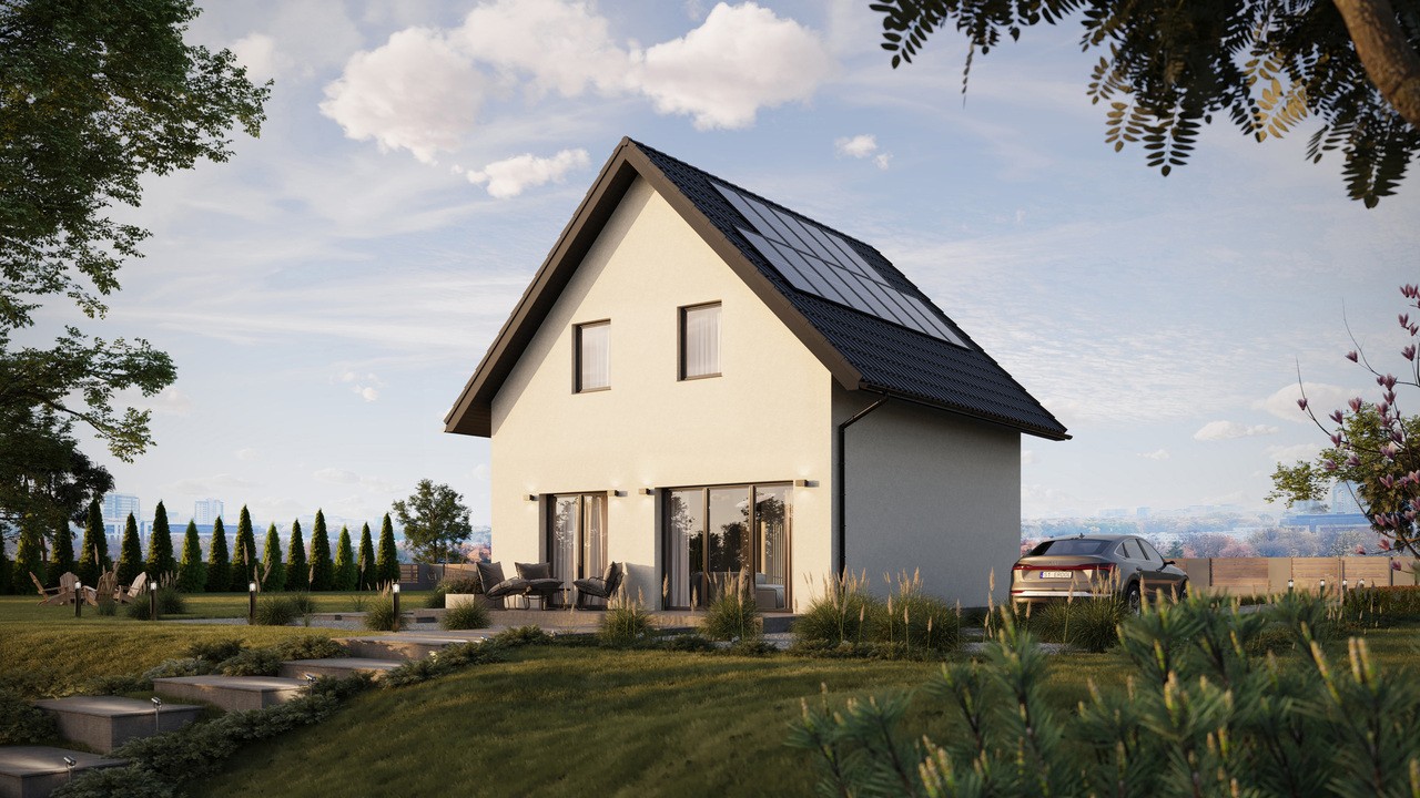 Dzięki niewielkiej płycie fundamentowej o powierzchni 64 m² koszt budowy pozostaje korzystny, a jednocześnie nie traci się na funkcjonalności.