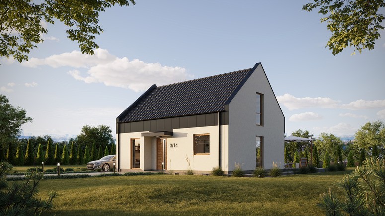 Projekt ERDOL 2 PLUS w wybranej konfiguracji posiada dach dwuspadowy nowoczesny z poddaszem użytkowym oraz wyposażony jest w stolarkę PVC firmy EUROCOLOR SYNEGO na profilu marki REHAU o szerokości 80mm w obustronnym kolorze antracytowym. Montowane drzwi zewnętrzne to drzwi firmy WIKĘD model 26h, ościeżnica Optimum Termo z szybą reflex.