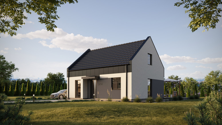 Projekt ERDOL 2 PLUS w wybranej konfiguracji posiada dach dwuspadowy nowoczesny z poddaszem użytkowym oraz wyposażony jest w stolarkę PVC firmy EUROCOLOR SYNEGO na profilu marki REHAU o szerokości 80mm w obustronnym kolorze antracytowym. Montowane drzwi zewnętrzne to drzwi firmy WIKĘD model 26h, ościeżnica Optimum Termo z szybą reflex.