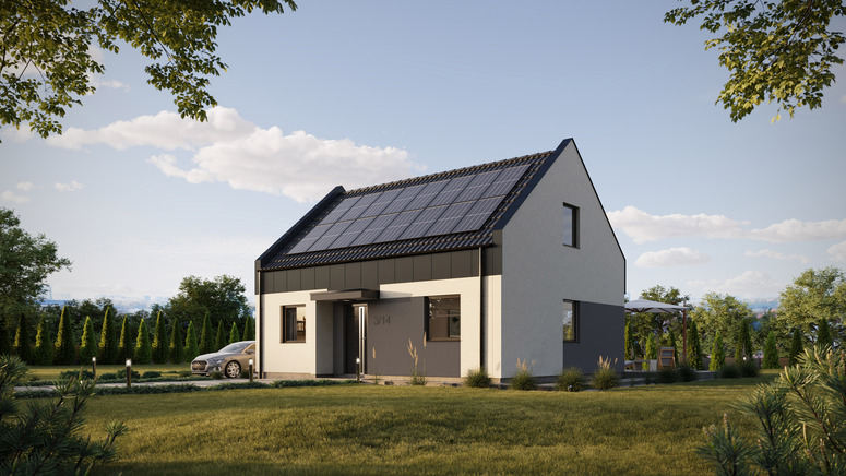 Projekt ERDOL 2 PLUS w wybranej konfiguracji posiada dach dwuspadowy nowoczesny z poddaszem użytkowym oraz wyposażony jest w stolarkę PVC firmy EUROCOLOR SYNEGO na profilu marki REHAU o szerokości 80mm w obustronnym kolorze antracytowym. Montowane drzwi zewnętrzne to drzwi firmy WIKĘD model 26h, ościeżnica Optimum Termo z szybą reflex.