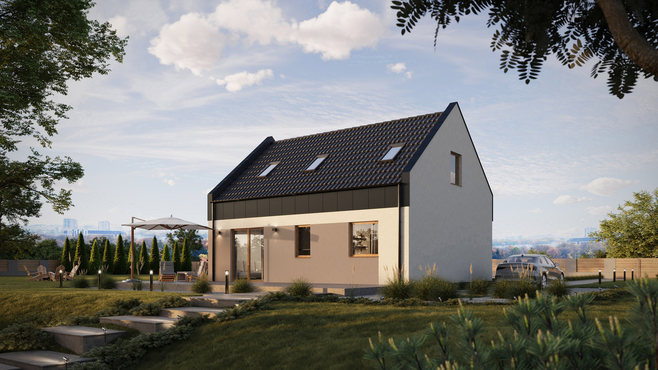 Projekt ERDOL 2 PLUS w wybranej konfiguracji posiada dach dwuspadowy nowoczesny z poddaszem użytkowym oraz wyposażony jest w stolarkę PVC firmy EUROCOLOR SYNEGO na profilu marki REHAU o szerokości 80mm w obustronnym kolorze antracytowym. Montowane drzwi zewnętrzne to drzwi firmy WIKĘD model 26h, ościeżnica Optimum Termo z szybą reflex.