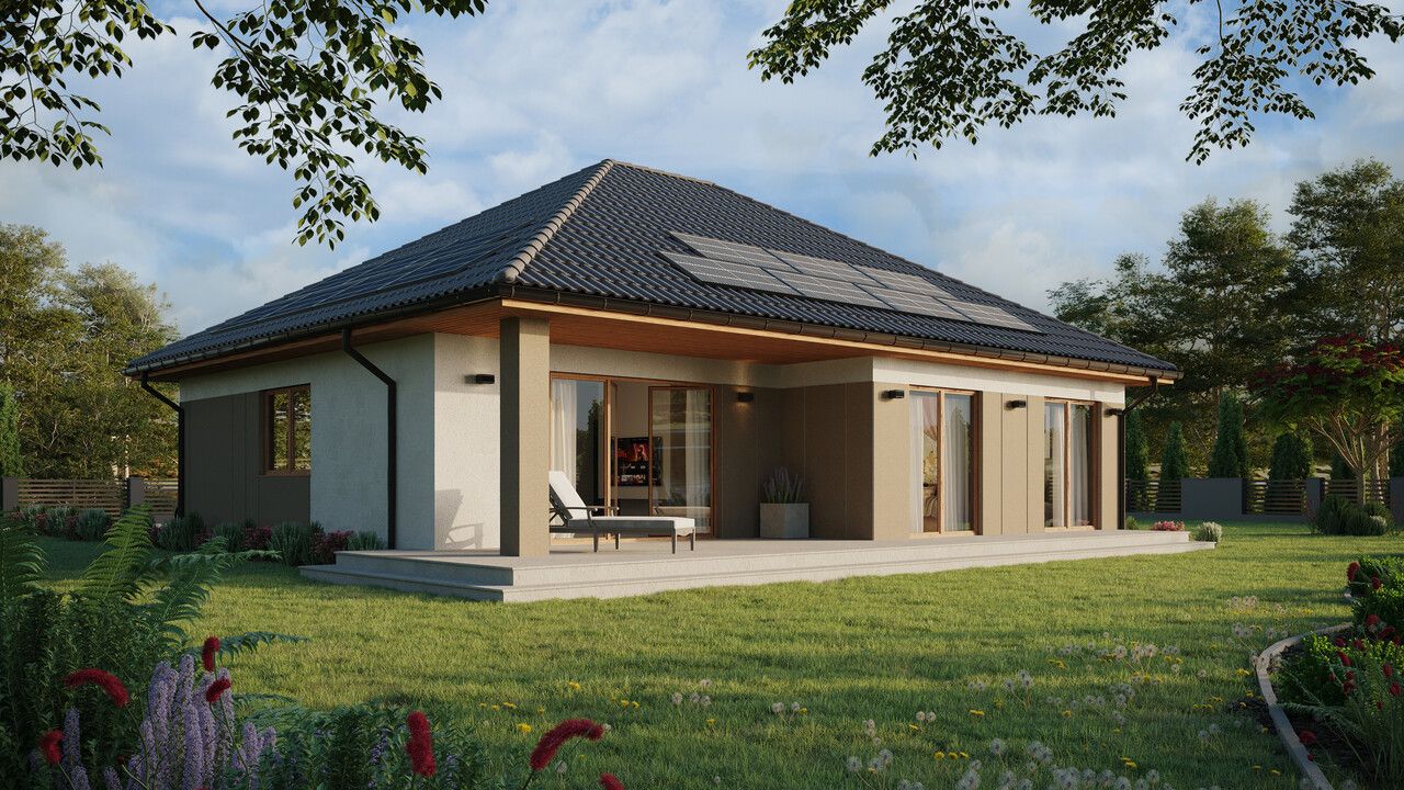 ERDOL 104 to dom o powierzchni 104 m², w którym znajdziesz miejsce na wszystko, czego potrzeba do wygodnego życia. Budynek ma prostą, a zarazem efektowną formę zwieńczoną czterospadowym dachem. Układ pomieszczeń został dokładnie przemyślany, aby optymalnie wykorzystać całą dostępną przestrzeń. Co ważne, taras budynku posiada podcień, pod którym można się schować w czasie deszczu. Istotny dla przyszłych mieszkańców może być także fakt, iż dom ten posiada 2 łazienki, co zdecydowanie ułatwia codzienne funkcjonowanie zwłaszcza przy większej liczbie domowników. Parterowy ERDOL 104, jak wszystkie nasze projekty, powstał z myślą o życiu w zgodzie z naturą, dlatego nie brakuje w nim energooszczędnych rozwiązań.