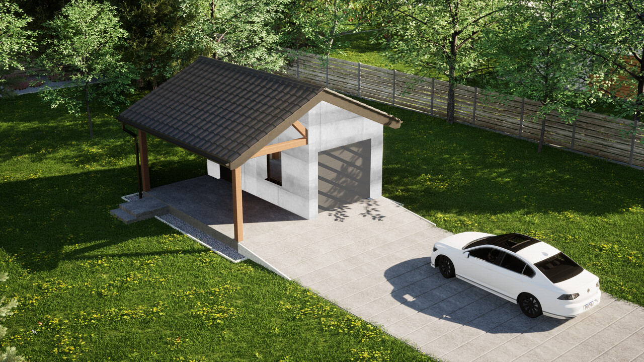 Konstrukcja garażu stworzona jest z tego samego drewna, co konstrukcja domów ERDOL HAUS, czyli z niezwykle wytrzymałego drewna KVH. Ściany garażu są wykończone i docieplone od strony zewnętrznej, a od strony wewnętrznej widoczny jest szkielet budynku.