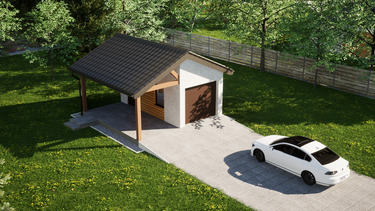 Garaż jednostanowiskowy z dodatkową wiatą ERDOL G1W to połączenie zamkniętego garażu o powierzchni 15,5 m² oraz wiaty z dachem o wymiarach 2,5 m na 5,9 m. Jest to układ, który pozwoli na wygodne przechowywanie jednego samochodu wewnątrz budynku, a jednego pod osłoną dachu.