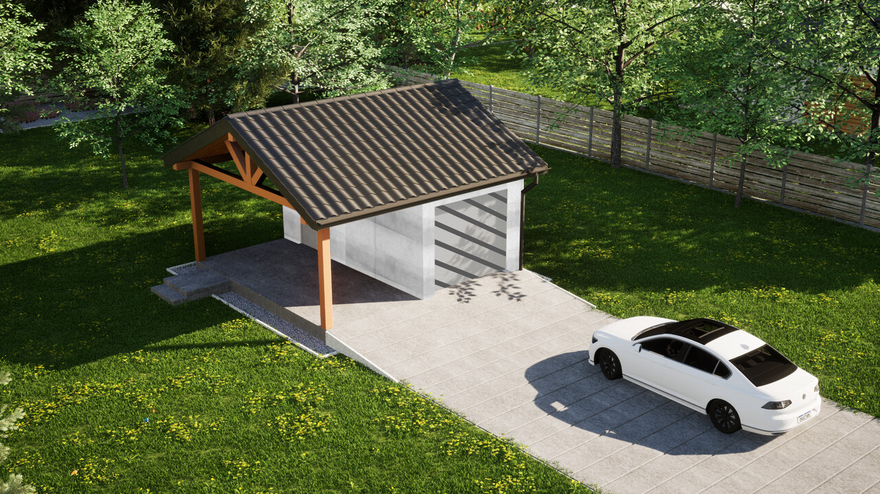 Garaż jednostanowiskowy z dodatkową wiatą ERDOL G1W to połączenie zamkniętego garażu o powierzchni 15,5 m² oraz wiaty z dachem o wymiarach 2,5 m na 5,9 m. Jest to układ, który pozwoli na wygodne przechowywanie jednego samochodu wewnątrz budynku, a jednego pod osłoną dachu.