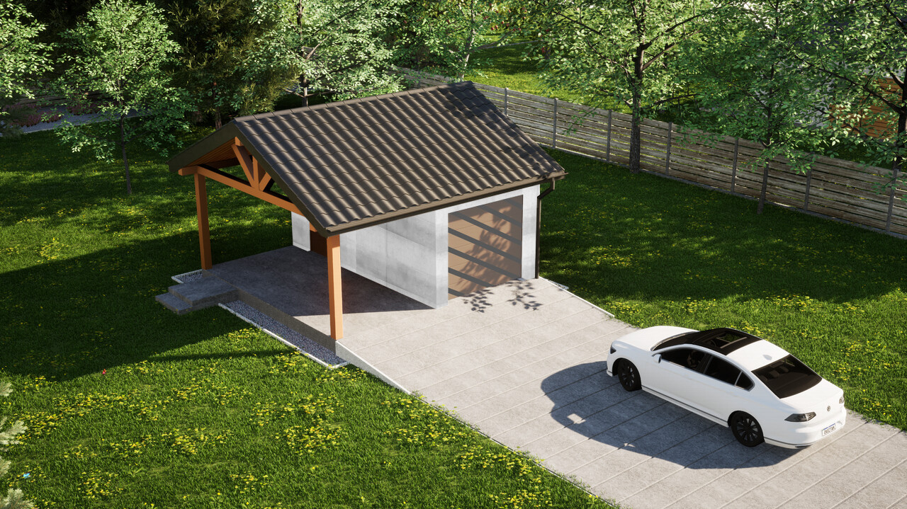 Garaż jednostanowiskowy z dodatkową wiatą ERDOL G1W to połączenie zamkniętego garażu o powierzchni 15,5 m² oraz wiaty z dachem o wymiarach 2,5 m na 5,9 m. Jest to układ, który pozwoli na wygodne przechowywanie jednego samochodu wewnątrz budynku, a jednego pod osłoną dachu.