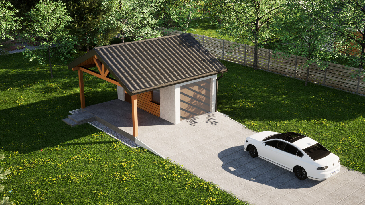 Garaż jednostanowiskowy z dodatkową wiatą ERDOL G1W to połączenie zamkniętego garażu o powierzchni 15,5 m² oraz wiaty z dachem o wymiarach 2,5 m na 5,9 m. Jest to układ, który pozwoli na wygodne przechowywanie jednego samochodu wewnątrz budynku, a jednego pod osłoną dachu.