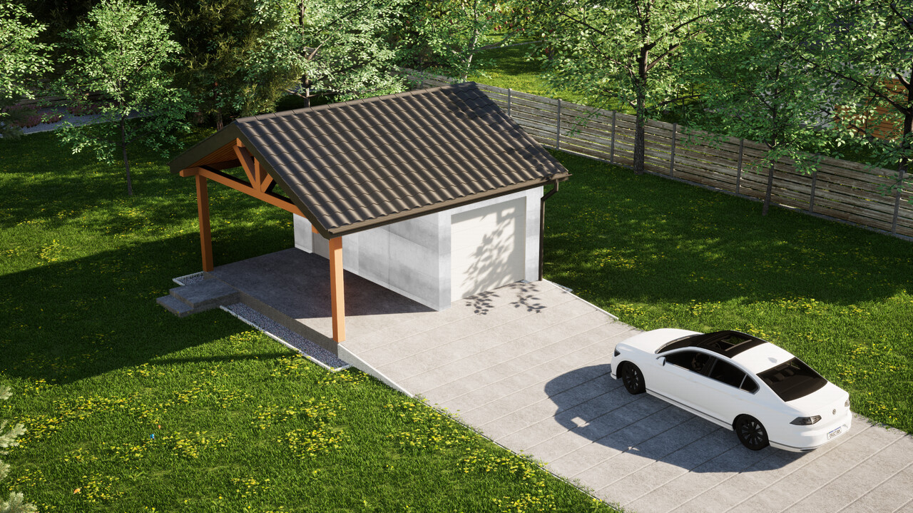 Garaż jednostanowiskowy z dodatkową wiatą ERDOL G1W to połączenie zamkniętego garażu o powierzchni 15,5 m² oraz wiaty z dachem o wymiarach 2,5 m na 5,9 m. Jest to układ, który pozwoli na wygodne przechowywanie jednego samochodu wewnątrz budynku, a jednego pod osłoną dachu.