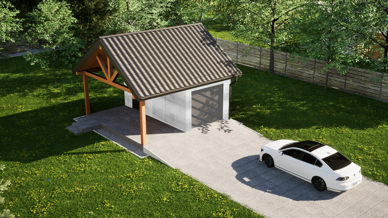 Garaż jednostanowiskowy z dodatkową wiatą ERDOL G1W to połączenie zamkniętego garażu o powierzchni 15,5 m² oraz wiaty z dachem o wymiarach 2,5 m na 5,9 m. Jest to układ, który pozwoli na wygodne przechowywanie jednego samochodu wewnątrz budynku, a jednego pod osłoną dachu.