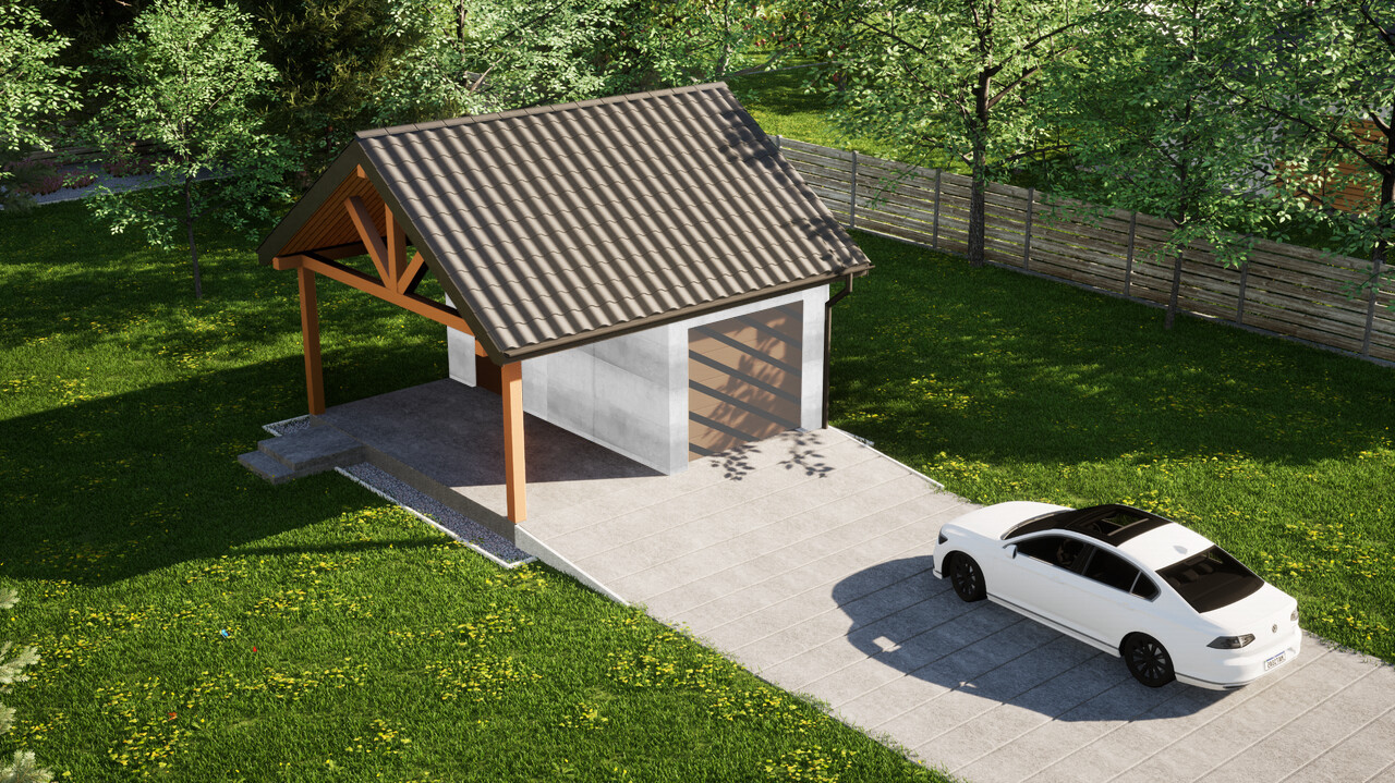 Garaż jednostanowiskowy z dodatkową wiatą ERDOL G1W to połączenie zamkniętego garażu o powierzchni 15,5 m² oraz wiaty z dachem o wymiarach 2,5 m na 5,9 m. Jest to układ, który pozwoli na wygodne przechowywanie jednego samochodu wewnątrz budynku, a jednego pod osłoną dachu.