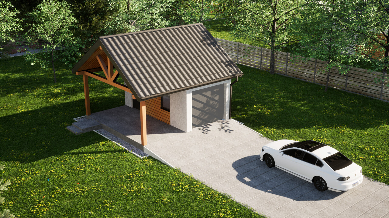 Garaż jednostanowiskowy z dodatkową wiatą ERDOL G1W to połączenie zamkniętego garażu o powierzchni 15,5 m² oraz wiaty z dachem o wymiarach 2,5 m na 5,9 m. Jest to układ, który pozwoli na wygodne przechowywanie jednego samochodu wewnątrz budynku, a jednego pod osłoną dachu.