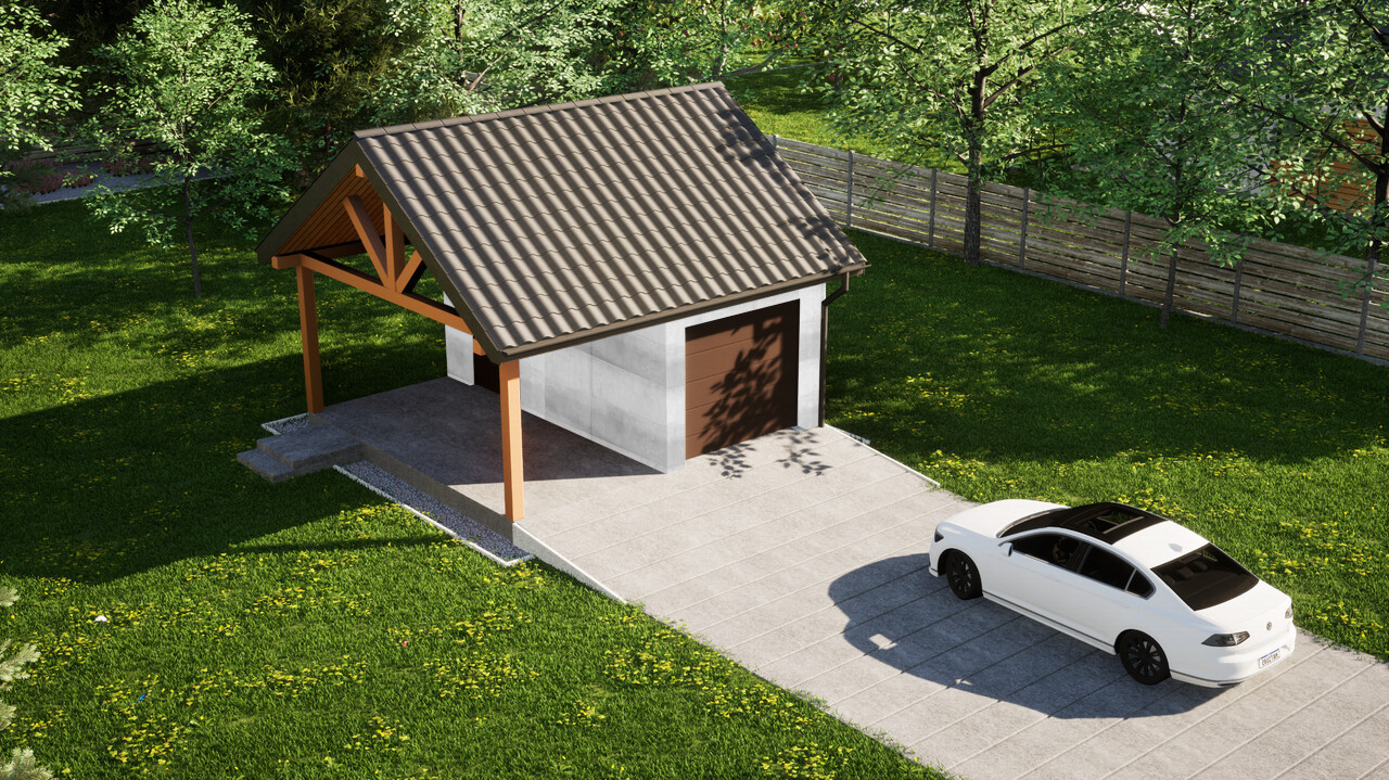 Garaż jednostanowiskowy z dodatkową wiatą ERDOL G1W to połączenie zamkniętego garażu o powierzchni 15,5 m² oraz wiaty z dachem o wymiarach 2,5 m na 5,9 m. Jest to układ, który pozwoli na wygodne przechowywanie jednego samochodu wewnątrz budynku, a jednego pod osłoną dachu.