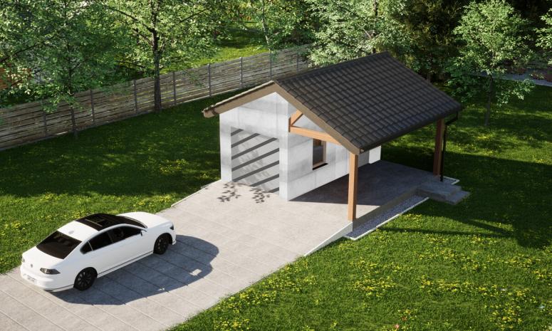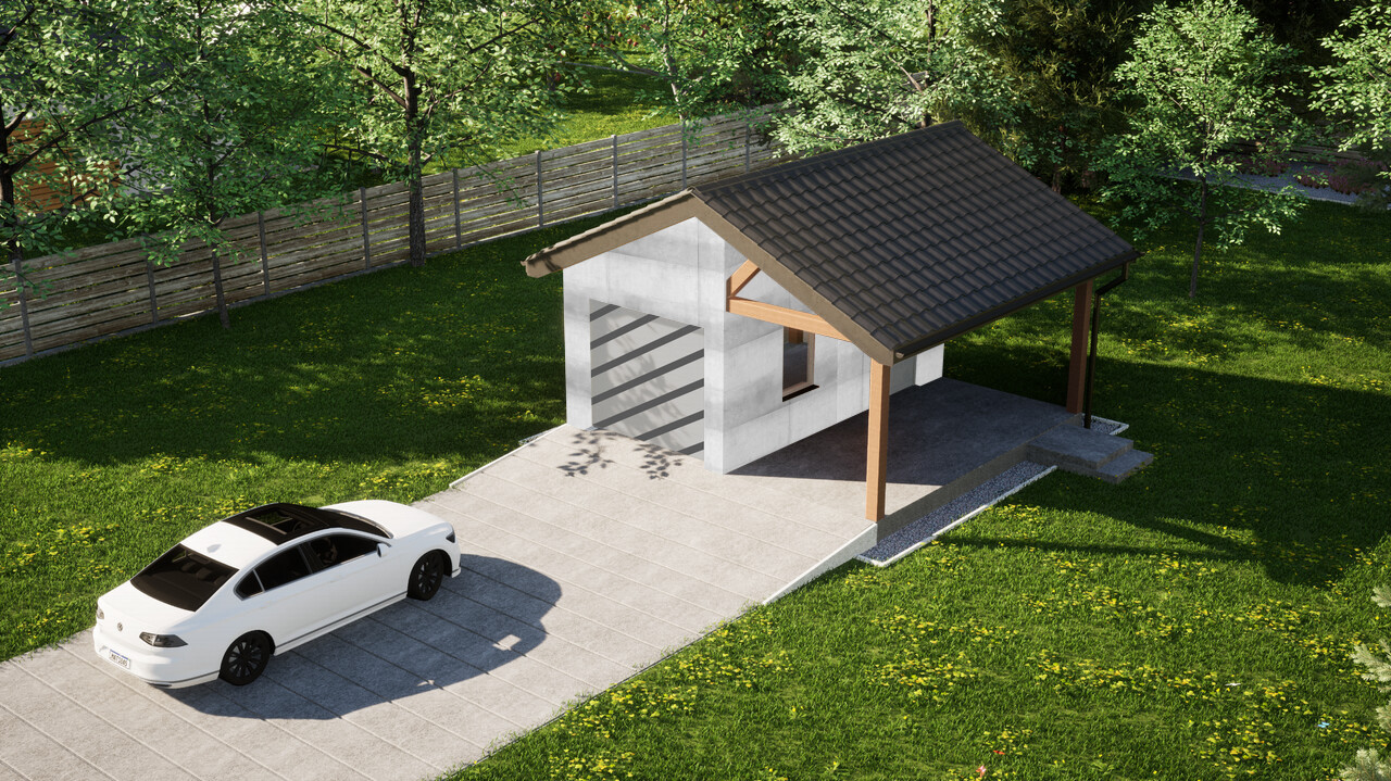 Garaż jednostanowiskowy z dodatkową wiatą ERDOL G1W to połączenie zamkniętego garażu o powierzchni 15,5 m² oraz wiaty z dachem o wymiarach 2,5 m na 5,9 m. Jest to układ, który pozwoli na wygodne przechowywanie jednego samochodu wewnątrz budynku, a jednego pod osłoną dachu.