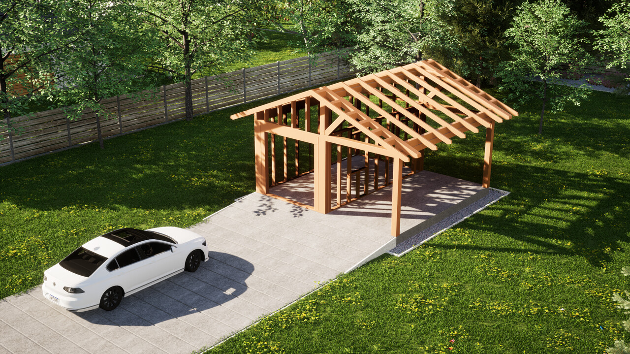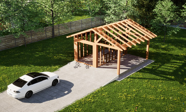 Konstrukcja garażu stworzona jest z tego samego drewna, co konstrukcja domów ERDOL HAUS, czyli z niezwykle wytrzymałego drewna KVH. Ściany garażu są wykończone i docieplone od strony zewnętrznej, a od strony wewnętrznej widoczny jest szkielet budynku.