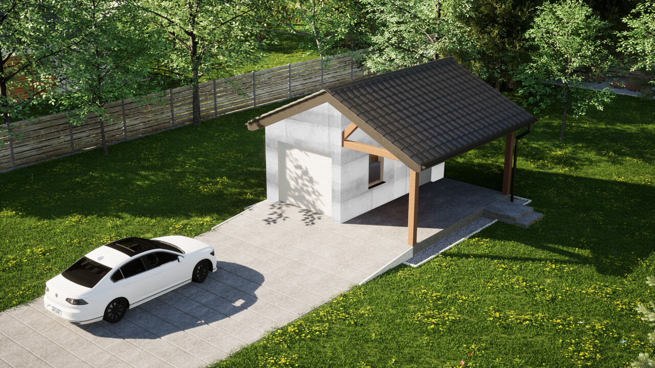 Garaż jednostanowiskowy z dodatkową wiatą ERDOL G1W to połączenie zamkniętego garażu o powierzchni 15,5 m² oraz wiaty z dachem o wymiarach 2,5 m na 5,9 m. Jest to układ, który pozwoli na wygodne przechowywanie jednego samochodu wewnątrz budynku, a jednego pod osłoną dachu.