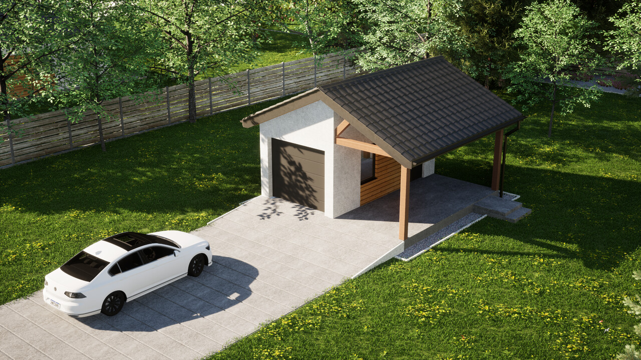 Garaż jednostanowiskowy z dodatkową wiatą ERDOL G1W to połączenie zamkniętego garażu o powierzchni 15,5 m² oraz wiaty z dachem o wymiarach 2,5 m na 5,9 m. Jest to układ, który pozwoli na wygodne przechowywanie jednego samochodu wewnątrz budynku, a jednego pod osłoną dachu.