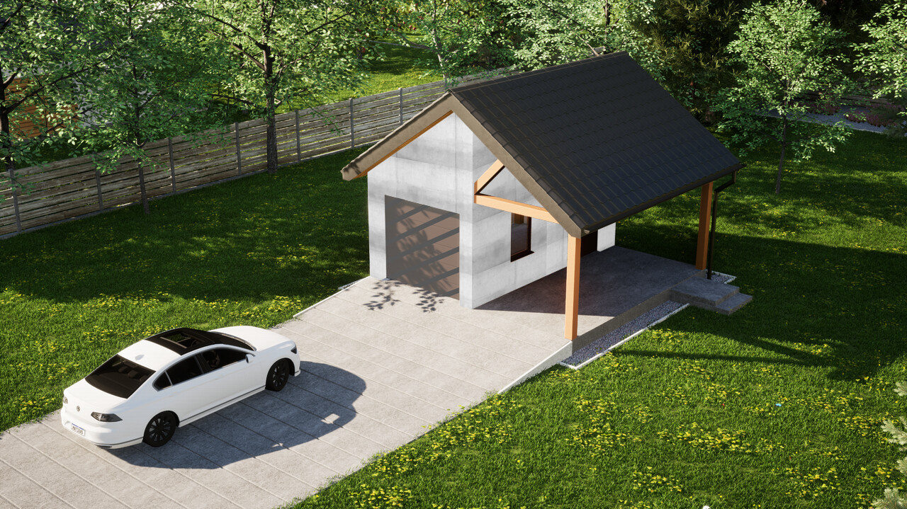 Garaż jednostanowiskowy z dodatkową wiatą ERDOL G1W to połączenie zamkniętego garażu o powierzchni 15,5 m² oraz wiaty z dachem o wymiarach 2,5 m na 5,9 m. Jest to układ, który pozwoli na wygodne przechowywanie jednego samochodu wewnątrz budynku, a jednego pod osłoną dachu.