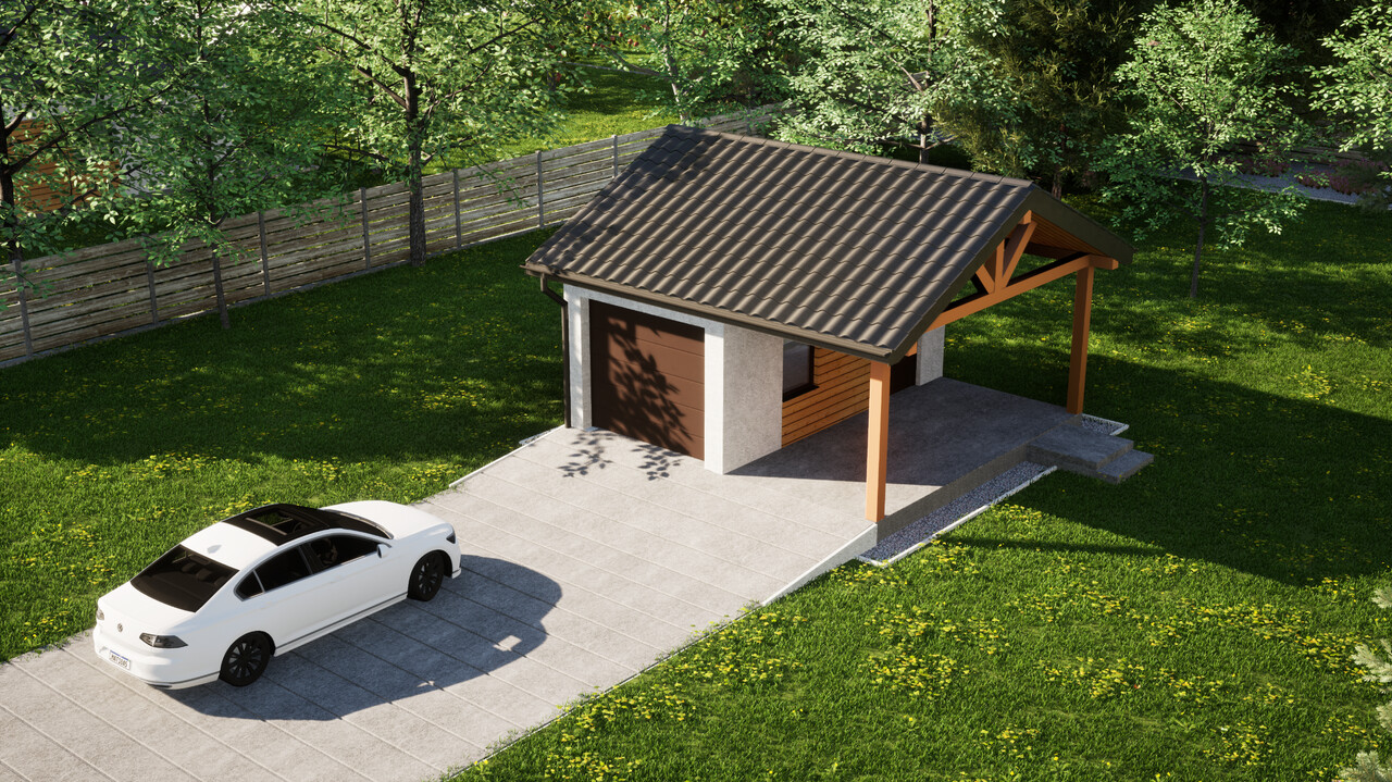 Garaż jednostanowiskowy z dodatkową wiatą ERDOL G1W to połączenie zamkniętego garażu o powierzchni 15,5 m² oraz wiaty z dachem o wymiarach 2,5 m na 5,9 m. Jest to układ, który pozwoli na wygodne przechowywanie jednego samochodu wewnątrz budynku, a jednego pod osłoną dachu.