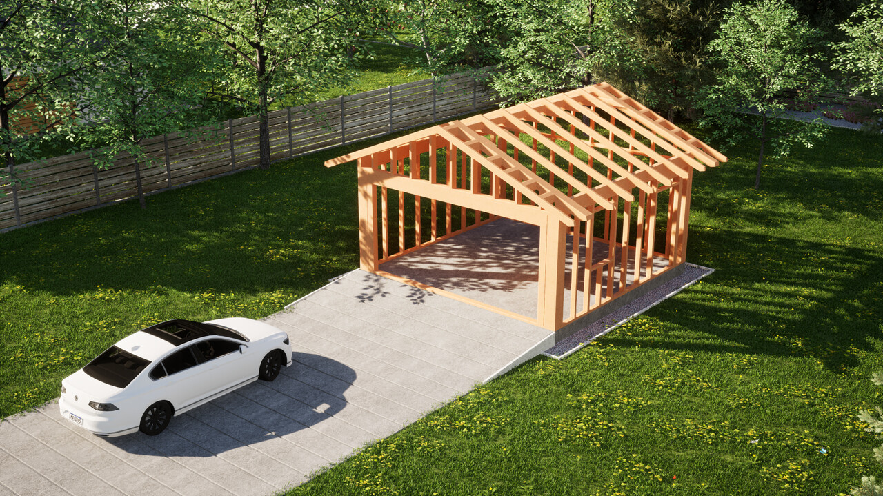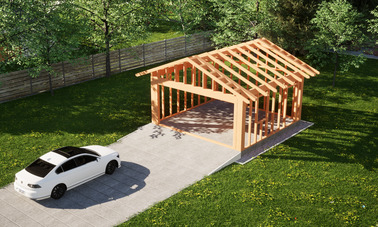 Konstrukcja garażu stworzona jest z tego samego drewna, co konstrukcja domów ERDOL HAUS, czyli z niezwykle wytrzymałego drewna KVH. Ściany garażu są wykończone i docieplone od strony zewnętrznej, a od strony wewnętrznej widoczny jest szkielet budynku.