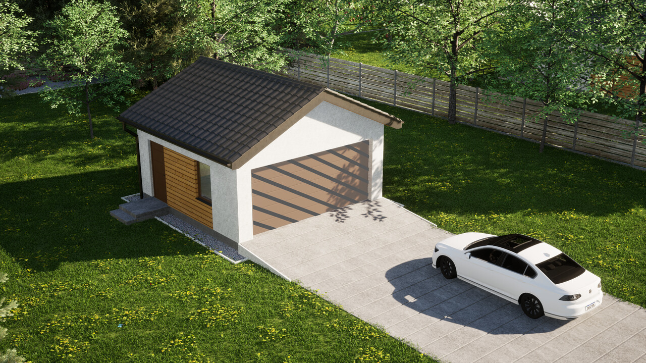 Garaż ERDOL G2 w wybranej konfiguracji posiada układ kalenicy prostopadły z dachem dwuspadowym o kącie nachylenia 25 stopni oraz wyposażony jest w stolarkę PVC KÖMMERLING/EUROCOLOR SYNEGO/VEKA w kolorze zloty dąb.