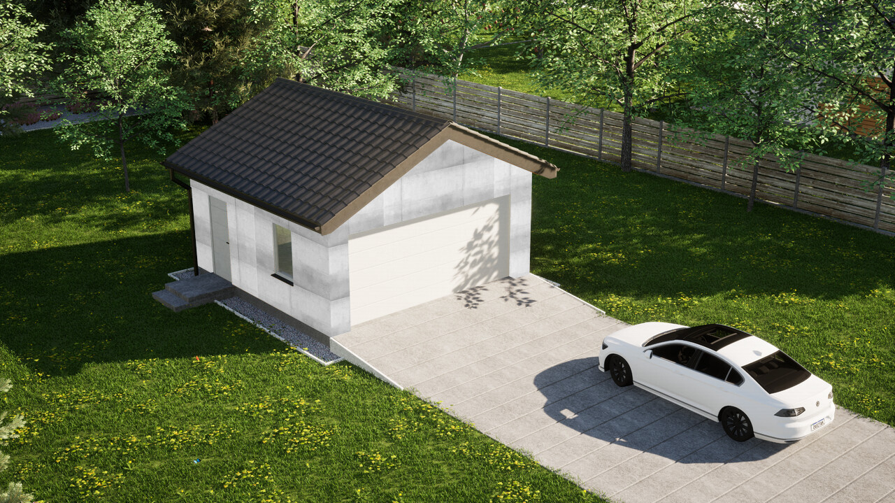 Konstrukcja garażu stworzona jest z tego samego drewna, co konstrukcja domów ERDOL HAUS, czyli z niezwykle wytrzymałego drewna KVH. Ściany garażu są wykończone i docieplone od strony zewnętrznej, a od strony wewnętrznej widoczny jest szkielet budynku.