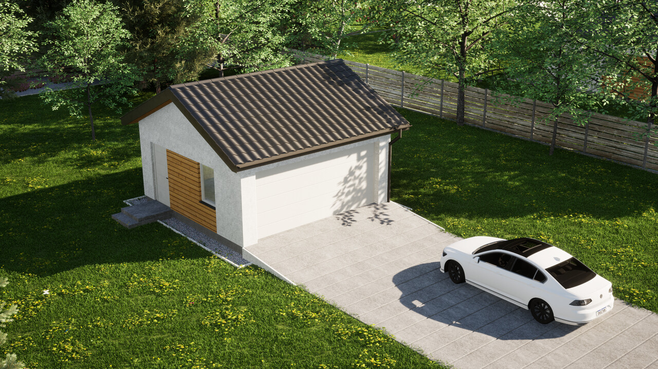 Garaż ERDOL G2 w wybranej konfiguracji posiada układ kalenicy równoległy z dachem dwuspadowym o kącie nachylenia 25 stopni, wyposażony jest w stolarkę PVC KÖMMERLING/EUROCOLOR SYNEGO/VEKA w kolorze białym oraz bramę segmentową UniPro firmy WIŚNIOWSKI z napędem IO oraz sterowaniem pilotem.