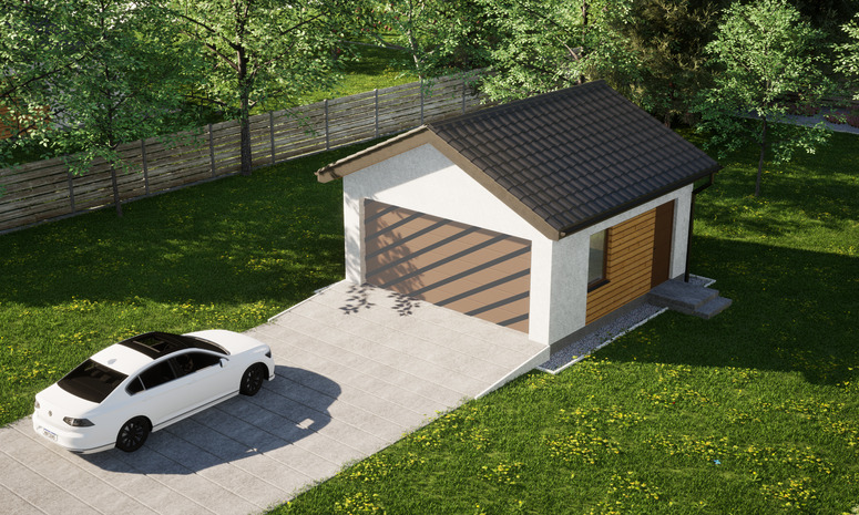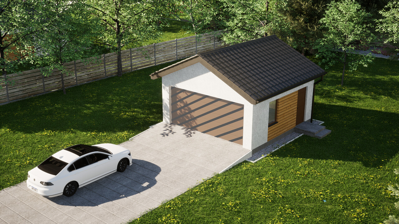 Garaż ERDOL G2 w wybranej konfiguracji posiada układ kalenicy prostopadły z dachem dwuspadowym o kącie nachylenia 25 stopni oraz wyposażony jest w stolarkę PVC KÖMMERLING/EUROCOLOR SYNEGO/VEKA w kolorze zloty dąb.