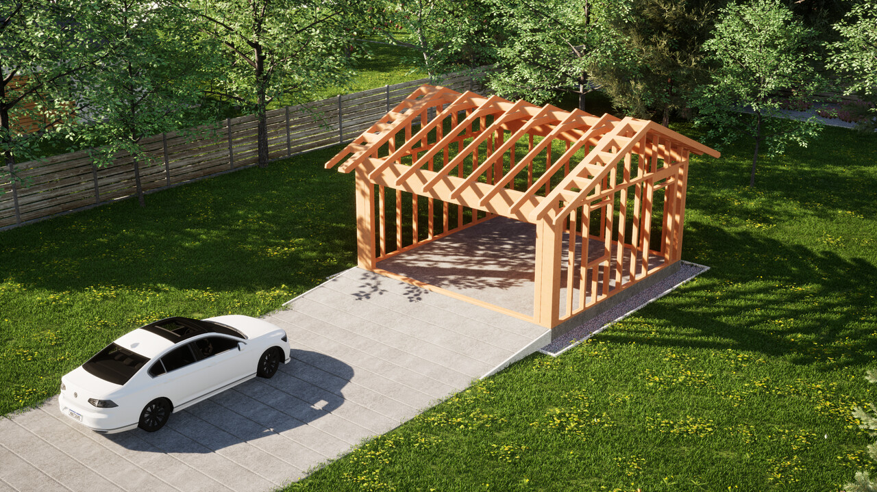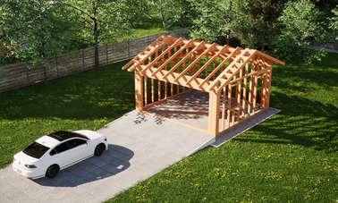 Konstrukcja garażu stworzona jest z tego samego drewna, co konstrukcja domów ERDOL HAUS, czyli z niezwykle wytrzymałego drewna KVH. Ściany garażu są wykończone i docieplone od strony zewnętrznej, a od strony wewnętrznej widoczny jest szkielet budynku.