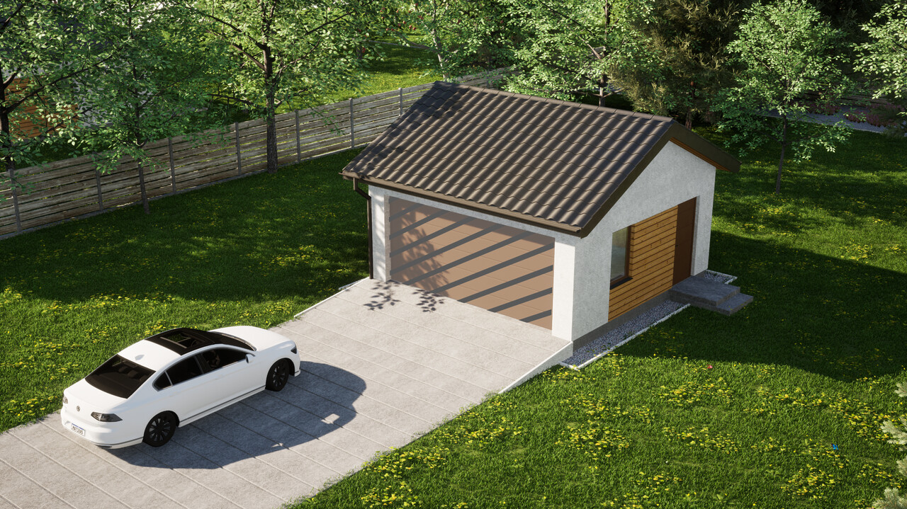 Garaż ERDOL G2 w wybranej konfiguracji posiada układ kalenicy równoległy z dachem dwuspadowym o kącie nachylenia 25 stopni oraz wyposażony jest w stolarkę PVC KÖMMERLING/EUROCOLOR SYNEGO/VEKA w kolorze zloty dąb.