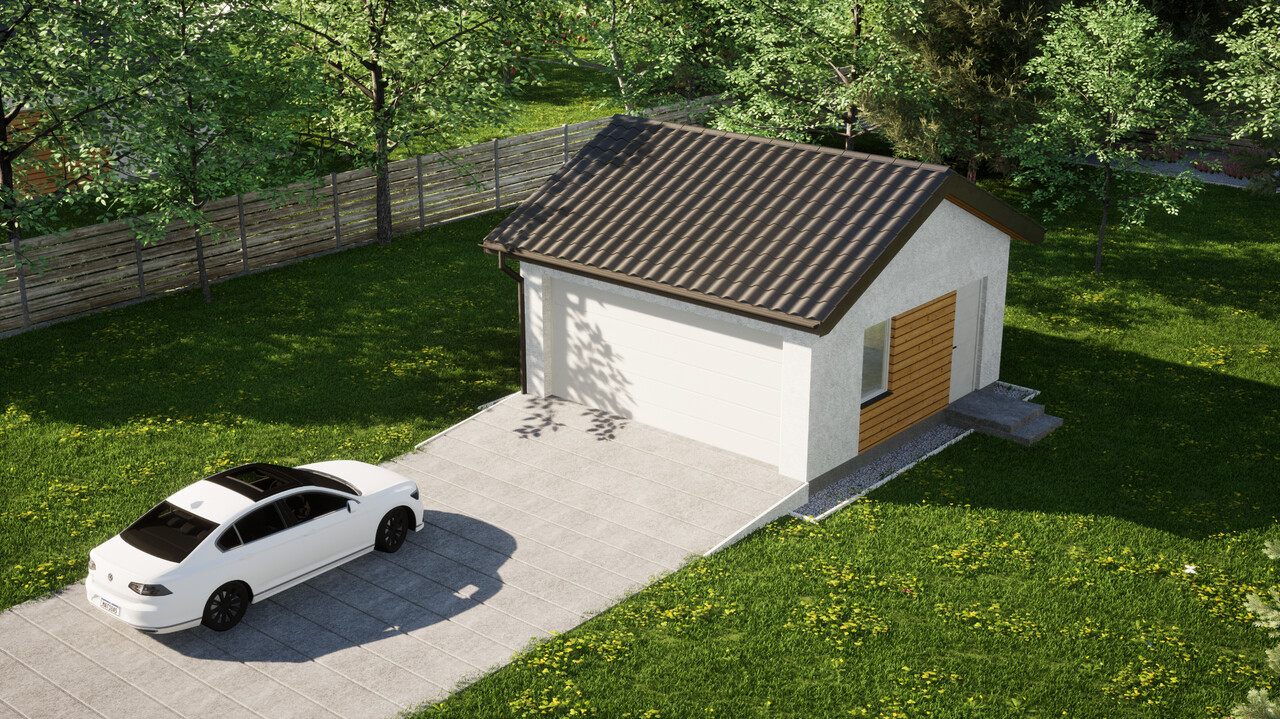 Garaż ERDOL G2 w wybranej konfiguracji posiada układ kalenicy równoległy z dachem dwuspadowym o kącie nachylenia 25 stopni, wyposażony jest w stolarkę PVC KÖMMERLING/EUROCOLOR SYNEGO/VEKA w kolorze białym oraz bramę segmentową UniPro firmy WIŚNIOWSKI z napędem IO oraz sterowaniem pilotem.
