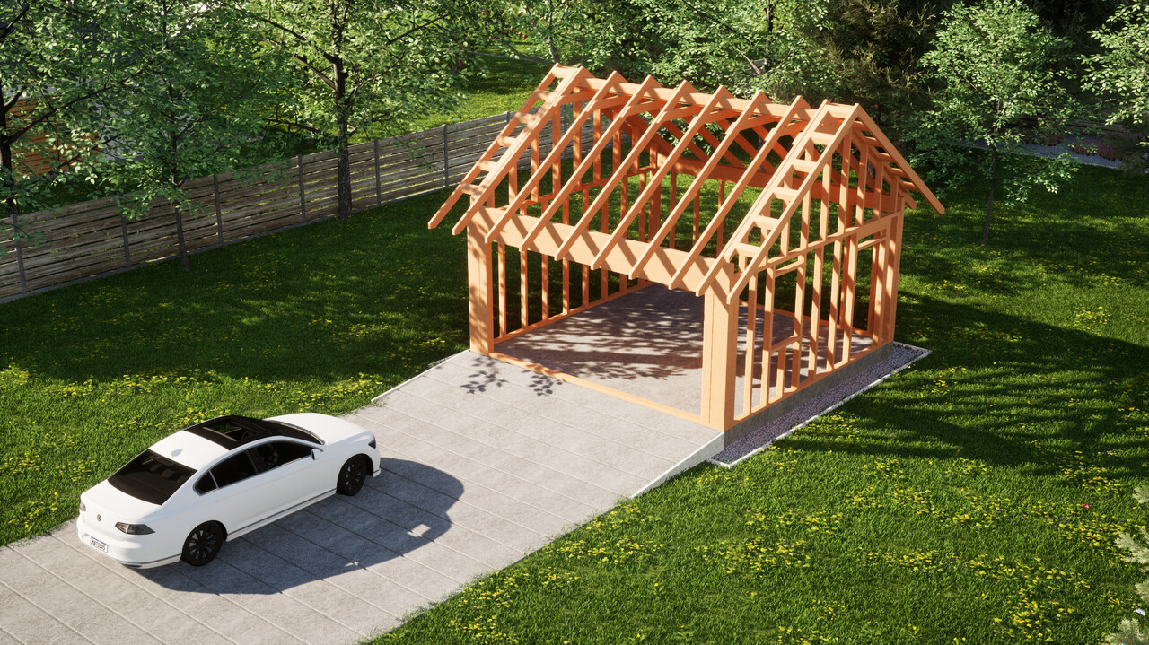 Konstrukcja garażu stworzona jest z tego samego drewna, co konstrukcja domów ERDOL HAUS, czyli z niezwykle wytrzymałego drewna KVH. Ściany garażu są wykończone i docieplone od strony zewnętrznej, a od strony wewnętrznej widoczny jest szkielet budynku.