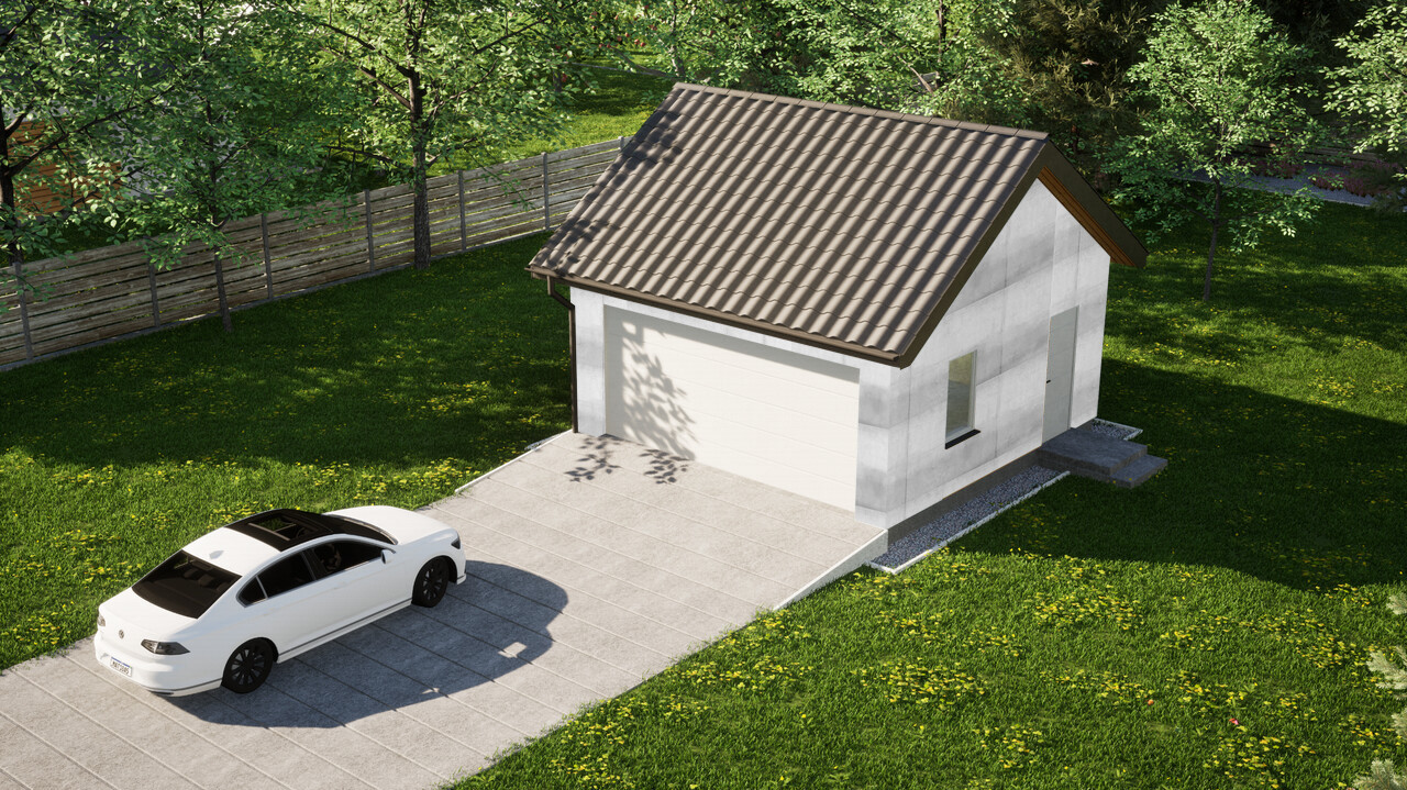Garaż ERDOL G2 w wybranej konfiguracji posiada układ kalenicy równoległy z dachem dwuspadowym o kącie nachylenia 35 stopni, wyposażony jest w stolarkę PVC KÖMMERLING/EUROCOLOR SYNEGO/VEKA w kolorze białym oraz bramę segmentową UniPro firmy WIŚNIOWSKI z napędem IO oraz sterowaniem pilotem.