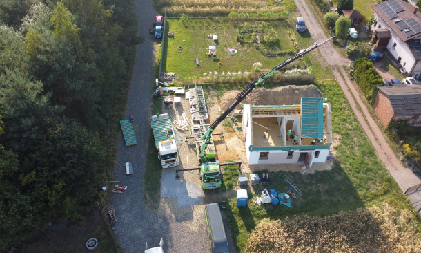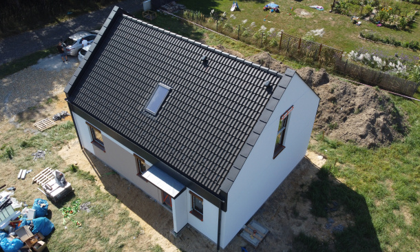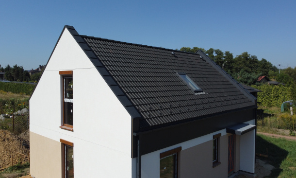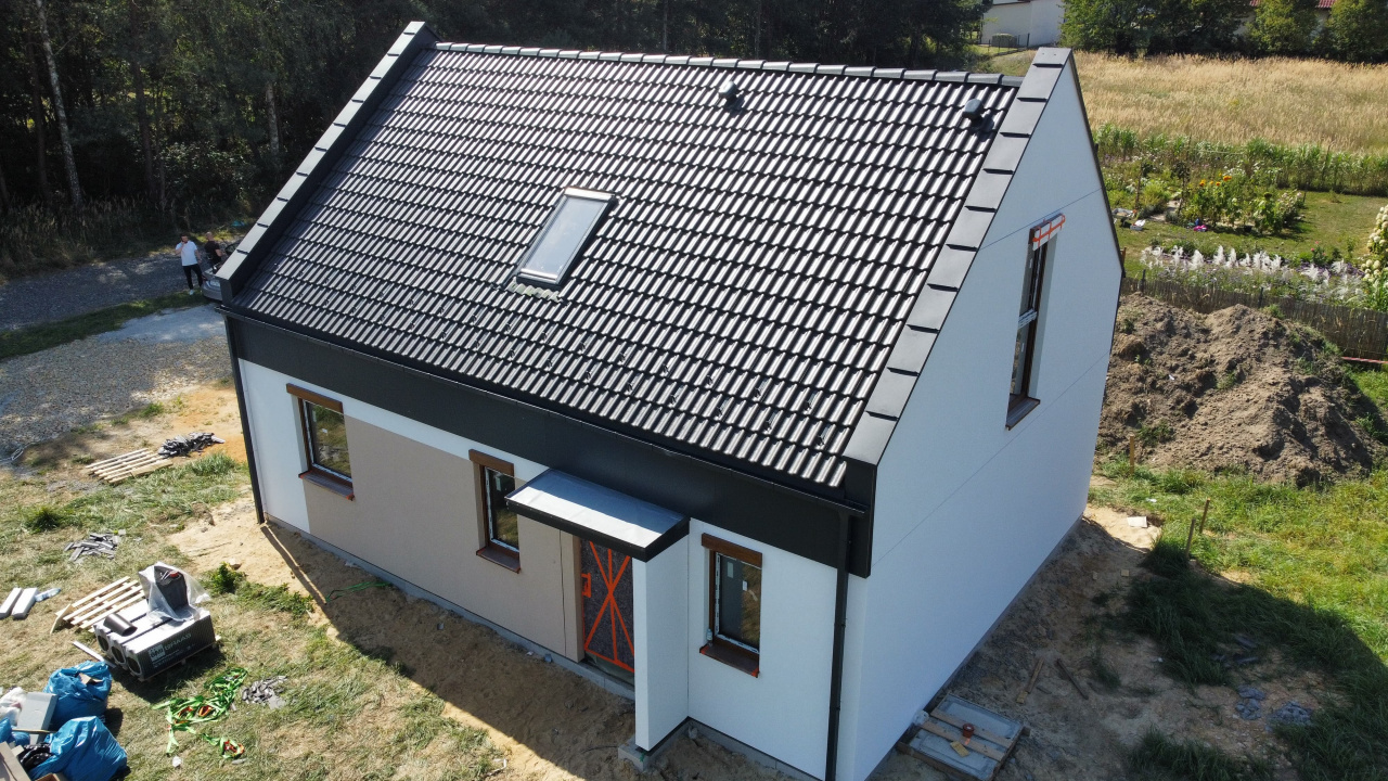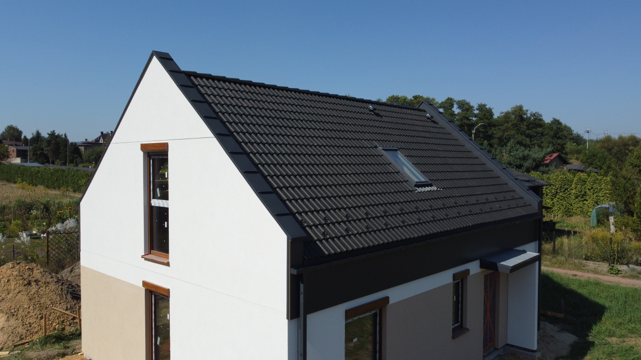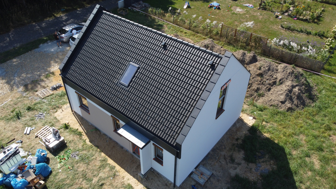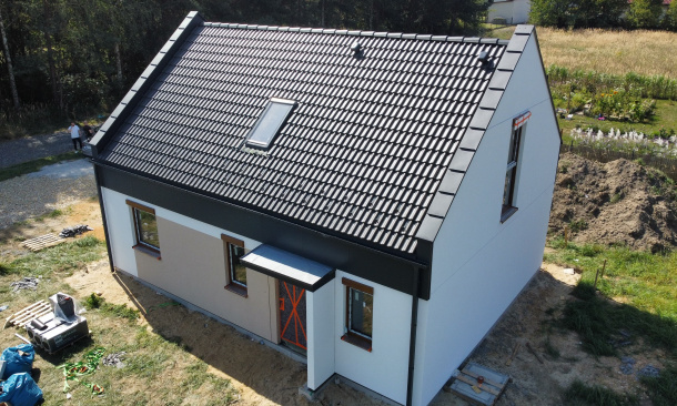 ERDOL HAUS PLUS jest to nowa linia domów, która charakteryzuje się nowoczesną bryłą oraz wstępnym wykończeniem budynku już w stanie surowym zamkniętym. Domy z tego standardu są budynkami z poddaszem użytkowym oraz maja powierzchnię od 139 m2 do 159 m2. Konstrukcja dachów jest wykonywana jako więźba tradycyjna, która jest wypełniona pierwszą warstwą wełny mineralnej o grubości 20 cm. Dach wykończony jest dachówką betonową BRAAS celtycka Lumino w kolorze grafit, obróbki blacharskie w kolorze antracyt, rynny stalowe kwadratowe Galeco. Kąt nachylenia połaci to 40 stopni, a dach jest dwuspadowy nowoczesny – ze ścianami attykowymi. Dodatkowym elementem występującym tylko w tym standardzie, jest zadaszenie nad wejściem budynku. Jest to daszek prefabrykowany w kształcie litery „L”. Ściany szczytowe są wykończone od wewnątrz płytą konstrukcyjną, posiadają peszle do instalacji elektrycznej oraz są wypełnione wełną mineralną. Strop domu jest prefabrykowany, wypełniony wełną, od góry zamknięty płytami konstrukcyjnymi, a od dołu jest przygotowany stelaż drewniany do montażu płyt G-K. Stolarka okienna obustronnie oklejona jest dostępna w dwóch opcjach kolorystycznych: antracyt i złoty dąb. Za dodatkową opłatą istnieje możliwość okna przesuwanego w salonie.