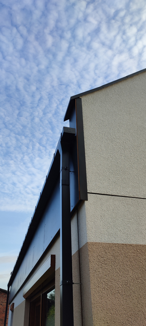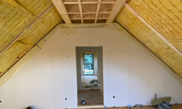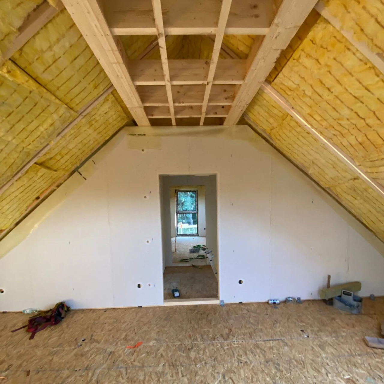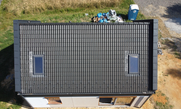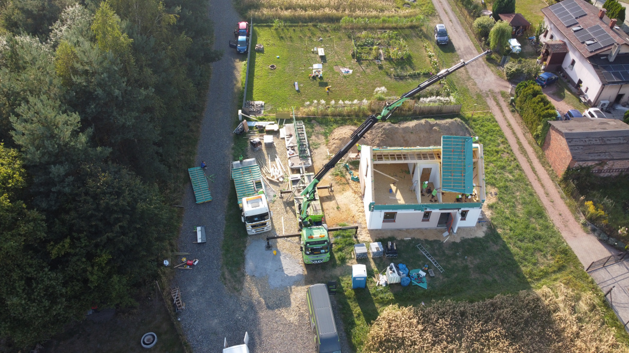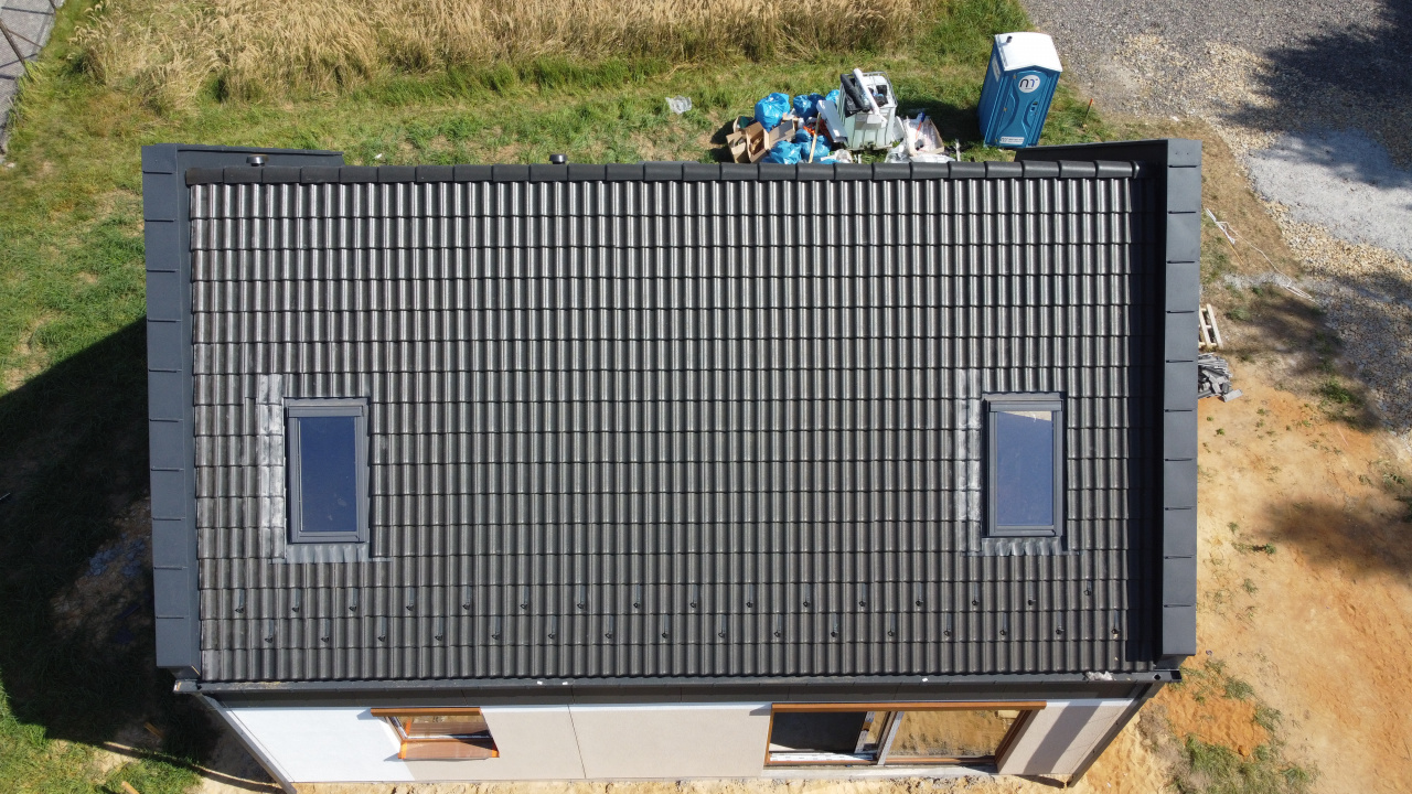 ERDOL HAUS PLUS jest to nowa linia domów, która charakteryzuje się nowoczesną bryłą oraz wstępnym wykończeniem budynku już w stanie surowym zamkniętym. Domy z tego standardu są budynkami z poddaszem użytkowym oraz maja powierzchnię od 139 m2 do 159 m2. Konstrukcja dachów jest wykonywana jako więźba tradycyjna, która jest wypełniona pierwszą warstwą wełny mineralnej o grubości 20 cm. Dach wykończony jest dachówką betonową BRAAS celtycka Lumino w kolorze grafit, obróbki blacharskie w kolorze antracyt, rynny stalowe kwadratowe Galeco. Kąt nachylenia połaci to 40 stopni, a dach jest dwuspadowy nowoczesny – ze ścianami attykowymi. Dodatkowym elementem występującym tylko w tym standardzie, jest zadaszenie nad wejściem budynku. Jest to daszek prefabrykowany w kształcie litery „L”. Ściany szczytowe są wykończone od wewnątrz płytą konstrukcyjną, posiadają peszle do instalacji elektrycznej oraz są wypełnione wełną mineralną. Strop domu jest prefabrykowany, wypełniony wełną, od góry zamknięty płytami konstrukcyjnymi, a od dołu jest przygotowany stelaż drewniany do montażu płyt G-K. Stolarka okienna obustronnie oklejona jest dostępna w dwóch opcjach kolorystycznych: antracyt i złoty dąb. Za dodatkową opłatą istnieje możliwość okna przesuwanego w salonie.