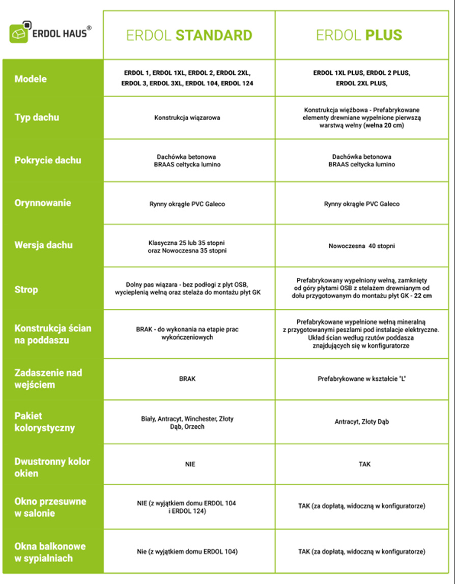 W linii STANDARD znajdują się domy o powierzchni od 59 m2 do 222 m2. Domy z tej grupy, za wyjątkiem Erdol 104, mają możliwość przystosowania poddasza, jako powierzchni użytkowej, dzięki konstrukcji wiązarowej dachu. Kąt nachylenia połaci jest możliwy w 4 opcjach (za wyjątkiem Erdol 104 oraz Erdol 124): 25 stopni – dwuspadowy, 25 stopni – czterospadowy, 35 stopni – dwuspadowy z okapem (możliwość poddasza użytkowego), 35 stopni – dwuspadowy nowoczesny (możliwość poddasza użytkowego). Dach nowoczesny oznacza, że dach jest bez okapów, ale posiada szczytowe ściany attykowe. Wykończenie dachów budynków z linii standard obejmuje dachówkę betonową BRAAS celtycka Lumino oraz rynny PCV firmy Galeco. Konstrukcja stropu jest wykonana z dolnego pasa wiązara i przygotowana do wykończenia przez Inwestora. Ściany szczytowe są wykończone z zewnątrz płytą konstrukcyjną oraz warstwami elewacyjnymi, a od środka pozostawiona jest surowa konstrukcja, którą kupujący może obrobić we własnym zakresie. Stolarka okienna z zewnętrznej strony jest dostępna w kolorach: biały, antracyt, winchester, złoty dąb oraz orzech. Od wewnątrz jest w kolorze białym. Domy Erdol 104 oraz Erdol 124 z grupy projektów standard, jako jedyne mają przesuwne okno w salonie w podstawowej wycenie.